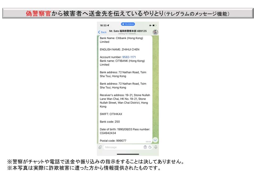 2 最近では、銀行員、警察官、税関職員、総領事館員を装った者による詐欺事案が増加しています。不審な電話がかかってきた際には、決して相手の言いなりにならず、お金の話をされたら、一旦電話を切って家族や知人など周りの人や警察に相談するなど、慎重な対応を心がけてください。